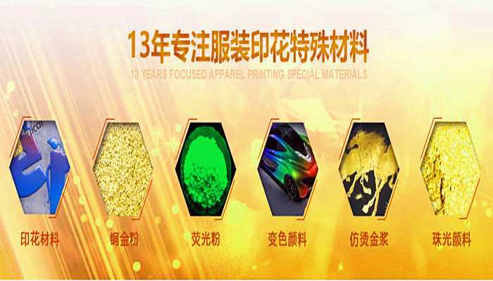 仿燙金漿 /熱固油墨 /厚版漿 /防升華膠漿 /裂紋漿 /彩拔漿 /洗水牛仔漿 /仿拔印漿 /絨面效果漿 /彩色熱固油 /更多+印染印花助劑 >>