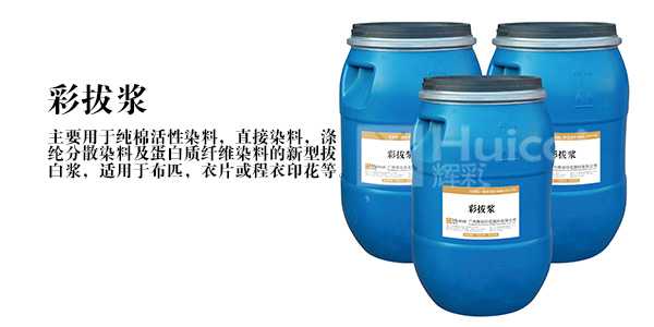 輝彩彩拔漿專門用于拔印工藝印花,其流動(dòng)性非常好,不塞網(wǎng),質(zhì)量穩(wěn)定,可達(dá)到高質(zhì)素的彩拔效果。使用方便、工藝簡(jiǎn)單,印花后焙烘或壓燙即可,具有高亮度和很有效的可拔印性。