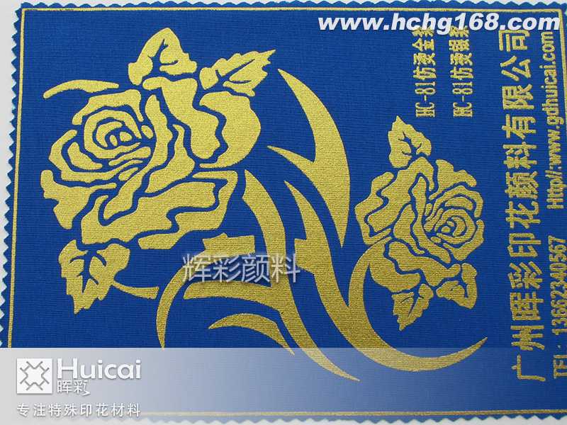 輝彩特牢仿燙金漿高彈力,牢固度特性,手感柔和,適合臺面印刷直接燙金,或用過熱壓燙燙金。而且產(chǎn)品并符合國際環(huán)保標志,適合要求洗水嚴格的客戶使用,燙后24小時洗水可達到最佳牢固效果。