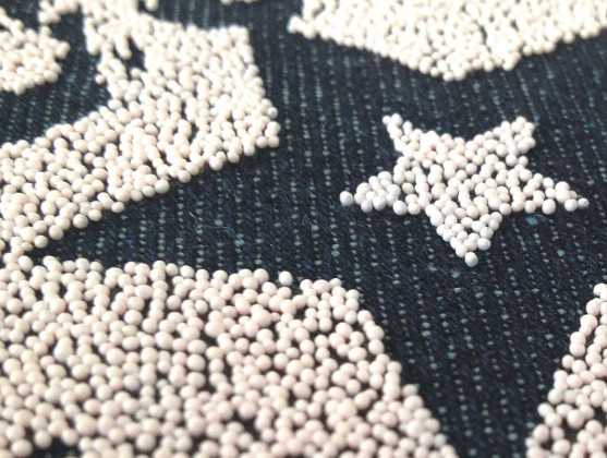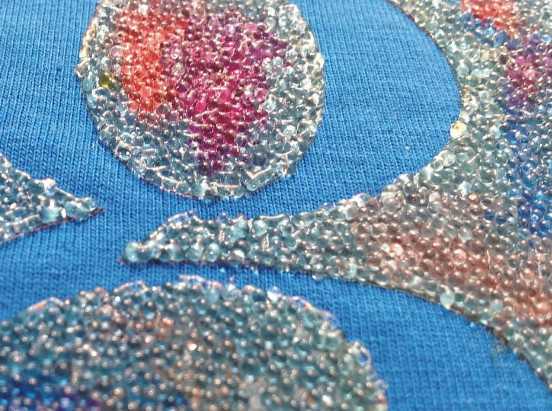 選用80—100目的網(wǎng)紗印刷,每次收刀時(shí)稍微輕些,可使下的粘珠漿留在布面上多些,盡量厚些,然后選用玻璃板輕放在印刷好膠珠的面料上微微輕壓,自然干透160—180度壓燙15秒,使表面膜變成透明,也可使用1-3%固色劑洗水效果更佳,制做半厚版,印刷→撒珠→輕壓。